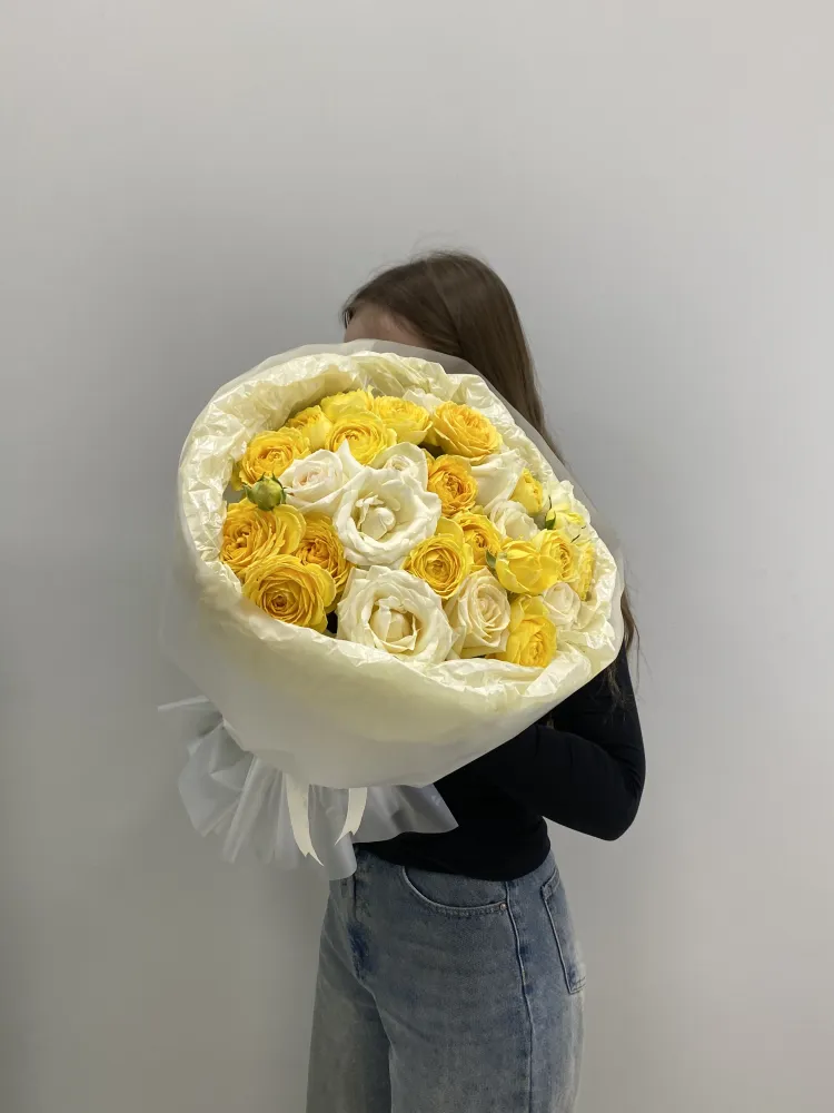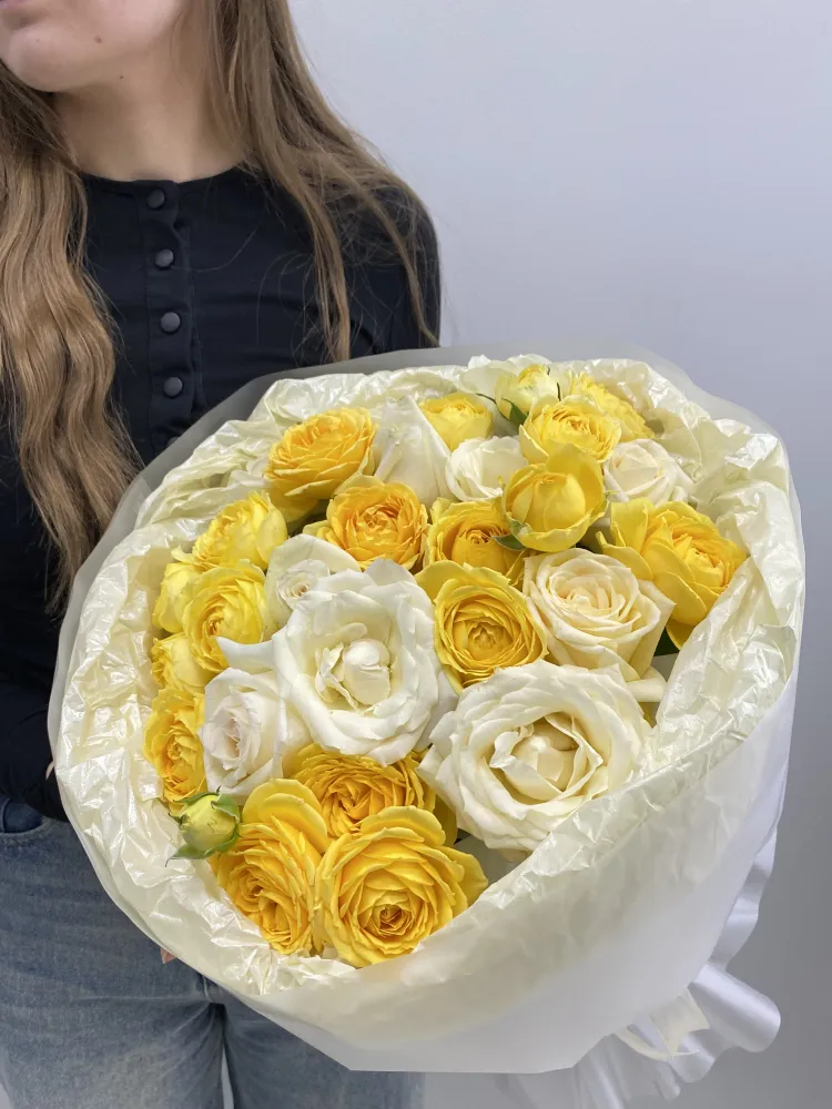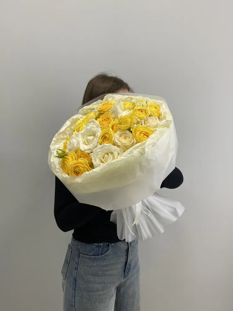 Купить цветы оптом Букет с розами Аваланж и кустовыми пионовидными розами