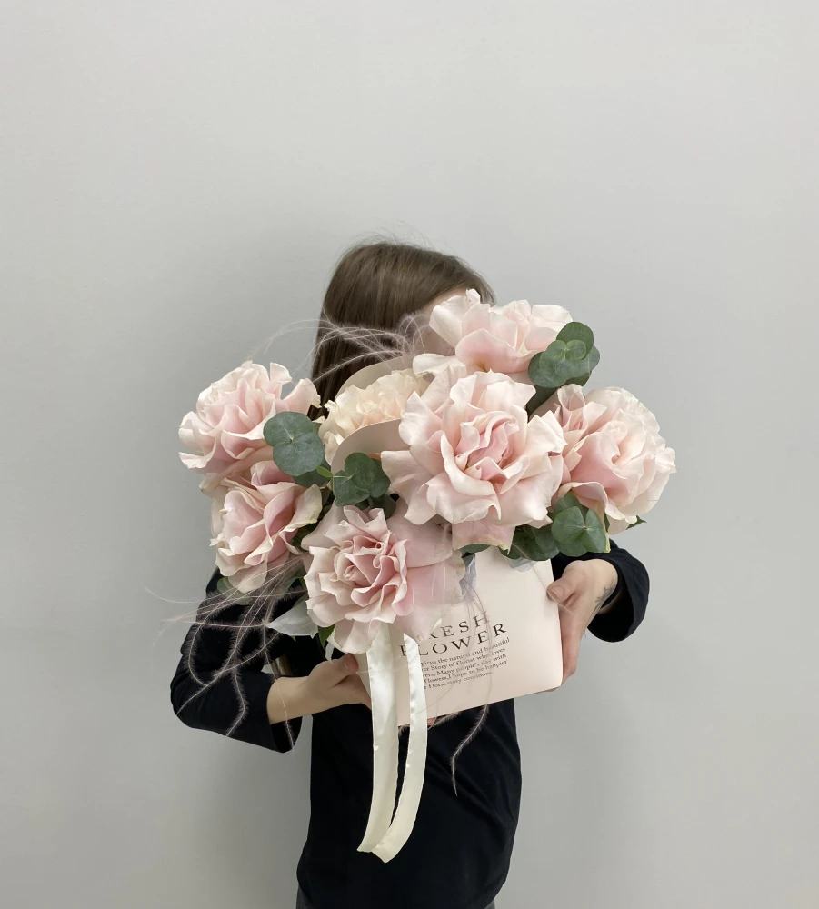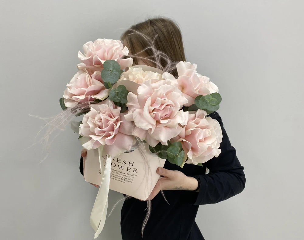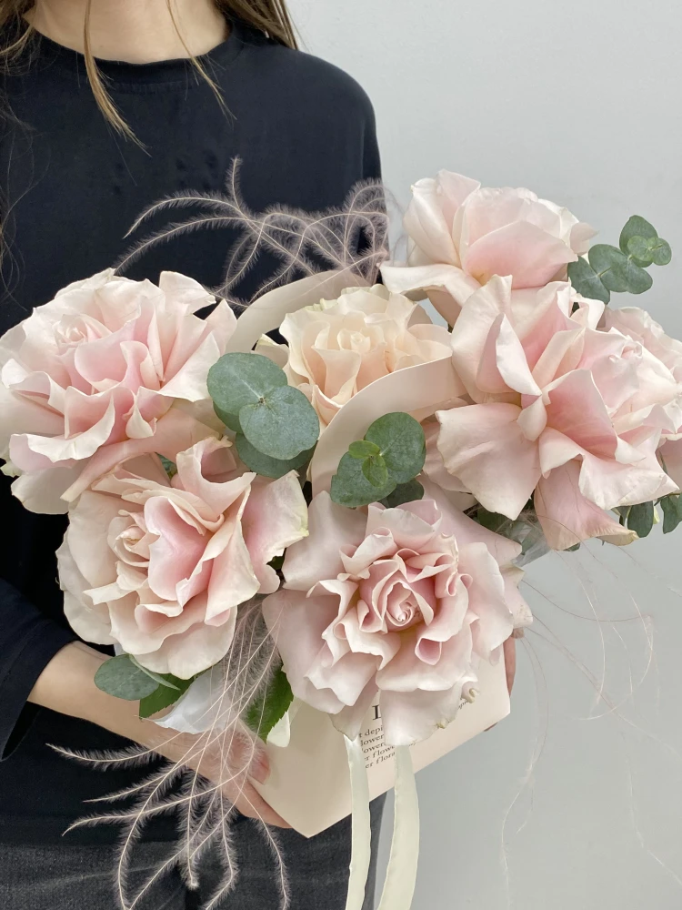 Купить цветы оптом Композиция из французских роз Пинк Мондиаль с эвкалиптом в сумочке